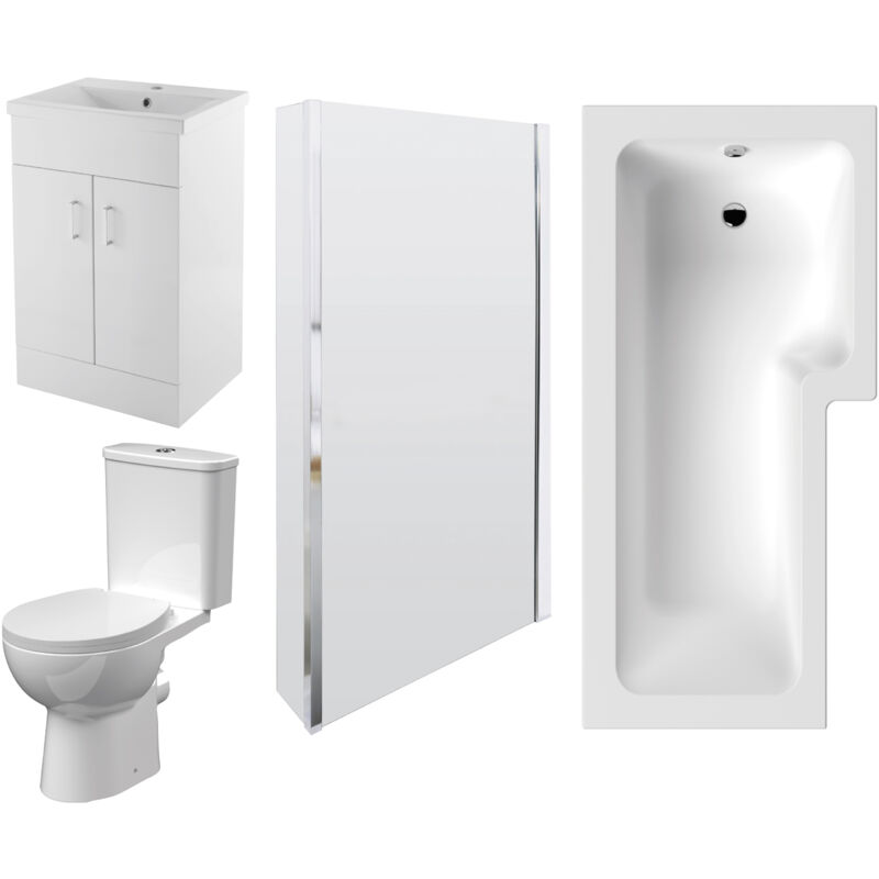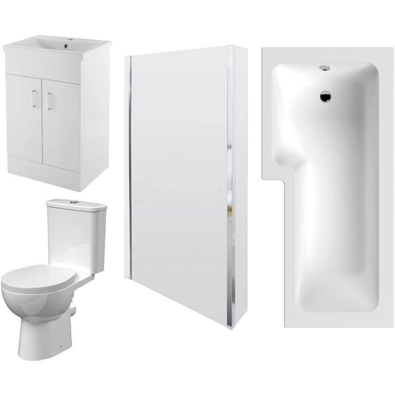 Balterley - 1700mm Bathroom Suite - l Shape Shower Bath, Front Panel, Shower Bath Screen, Vanity Basin Unit and Toilet and Seat, Gloss White