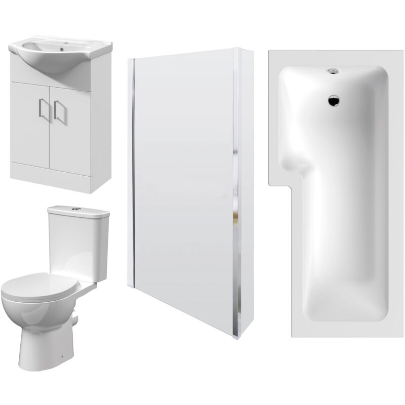 Balterley - 1700mm Bathroom Suite - l Shape Shower Bath, Front Panel, Shower Bath Screen, Vanity Basin Unit and Toilet and Seat, Gloss White