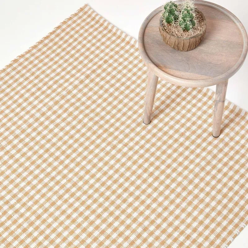 Homescapes Cotton Gingham Check Rug Hand Woven in Beige Size: 60cm x 90cm - Beige - Size: 60cm x 90cm