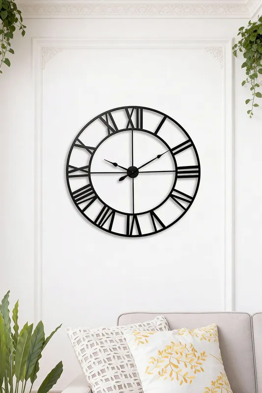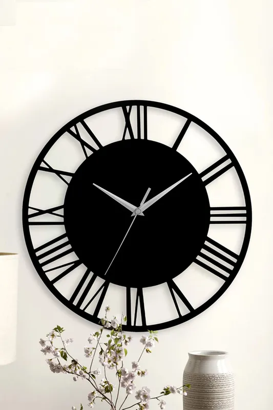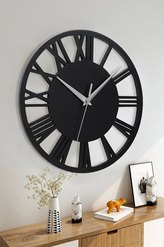Living and Home 40cm Dia Black Round Roman Numeral Skeleton Metal Wall Clock Black