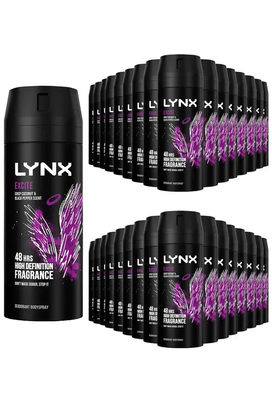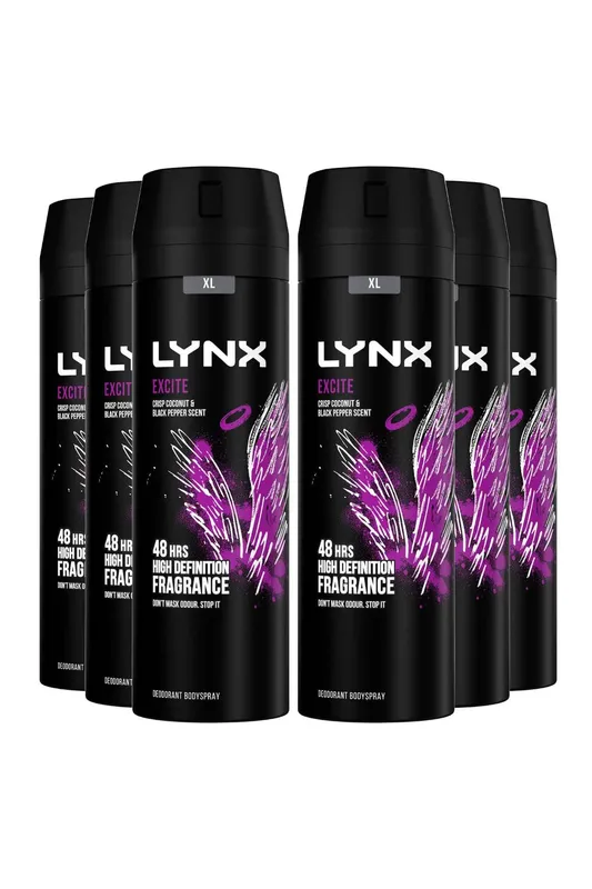 Lynx Men's Excite Body Spray Deodorant 48Hrs HD Fragrance 150ml, 36 Pack in Black Black