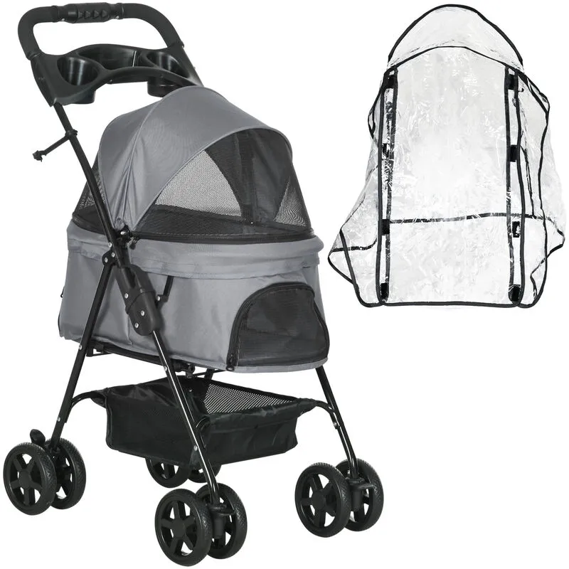 PawHut Small Dog Stroller with Cover, Folding Cat Pram Pushchair with Cup Holder, Storage Basket, Reflective Strips, Grey Aosom UK