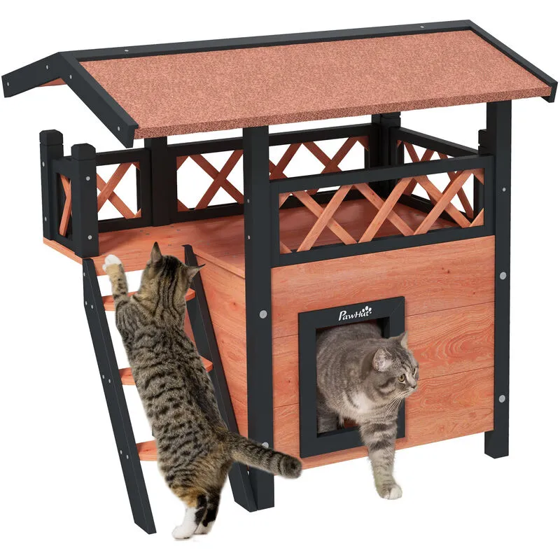 Pawhut - Outdoor Cat House w/ Balcony Stairs Roof Brown