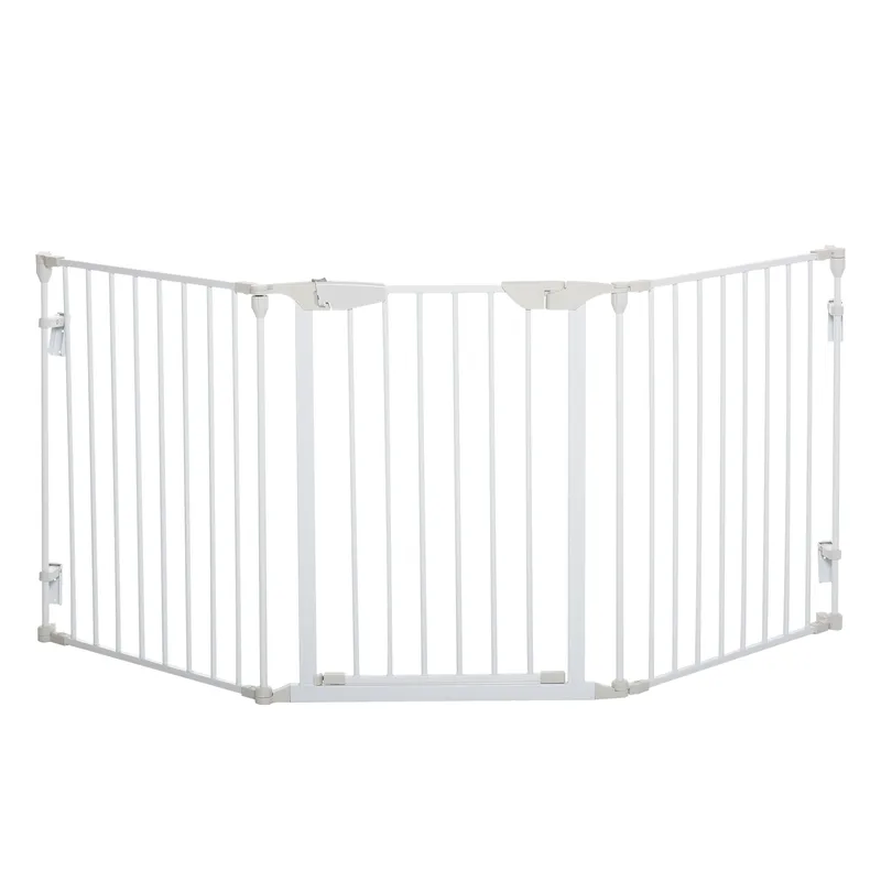 PawHut Pet Safety Gate 3-Panel Playpen Fireplace Christmas Tree Metal Fence Stair Barrier Room Divider w/Walk Through Door, White Aosom UK
