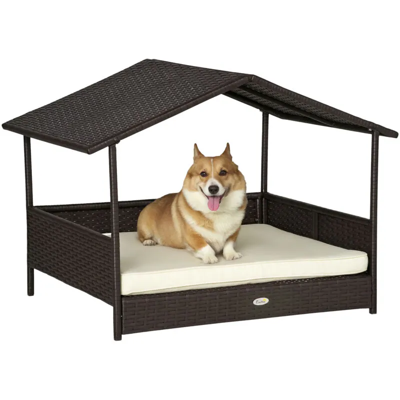 PawHut Rattan Dog House, Elevated Wicker Bed Lounge Removable Cushion and Canopy Cream