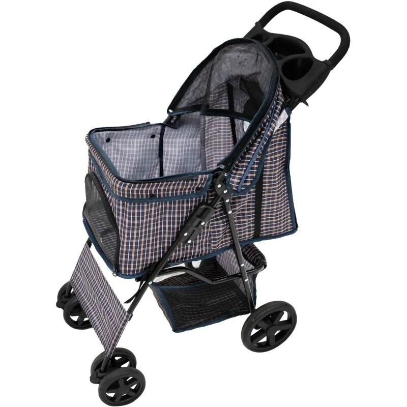 Monstershop Pet Stroller w/ Rain Cover & Caddy Bag - Blue Tartan Size: 65cm Blue 65cm female