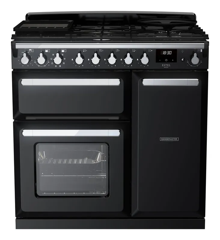 Rangemaster Estel Deluxe ESDL90DFPGBL/CM1 90cm Wide Gloss Black Dual Fuel Freestanding Range Cooker - Chrome Trim