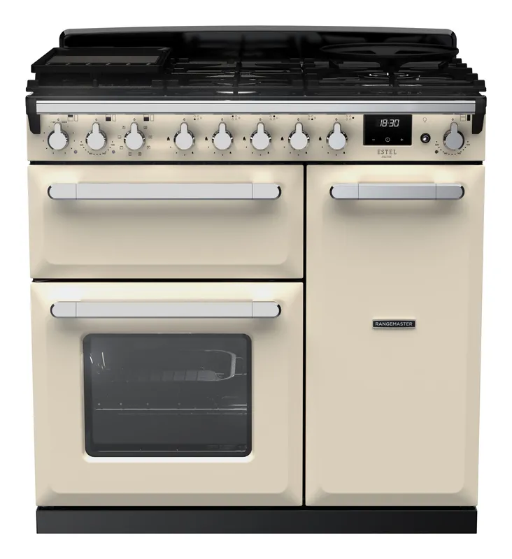 Rangemaster Estel Deluxe ESDL90DFPPCR/CM1 90cm Wide Pale Cream Dual Fuel Freestanding Range Cooker - Chrome Trim