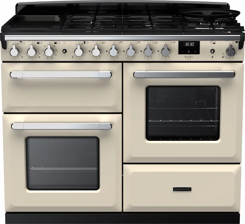 Rangemaster Estel Deluxe ESDLO110DFPPCR/CM1 110cm wide Dual Fuel Range Cooker with Gas Hob - Cream / Chrome - A/A Rated, Cream
