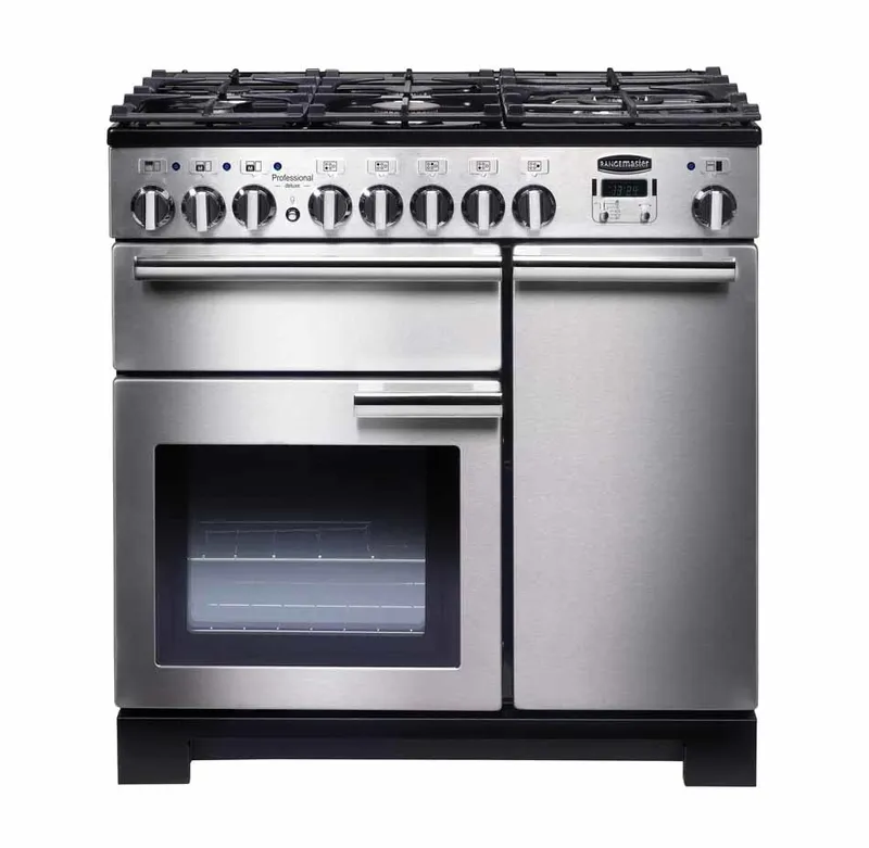 Rangemaster Professional Deluxe PDL90DFFSS/C 90cm Wide Stainless Steel Dual Fuel Freestanding Range Cooker - Chrome Trim