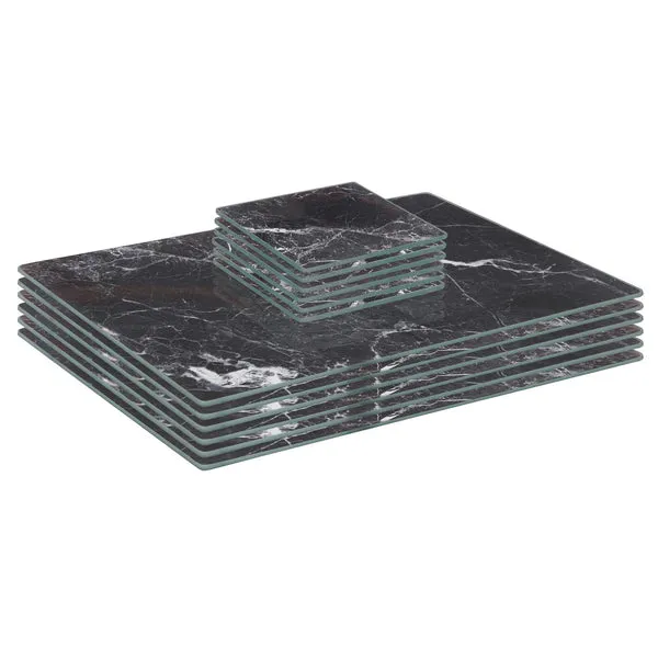 Harbour Housewares 12pc Rectangle Glass Placemats & Square Coasters Set - 30cm x 20cm - Marble - Black Marble