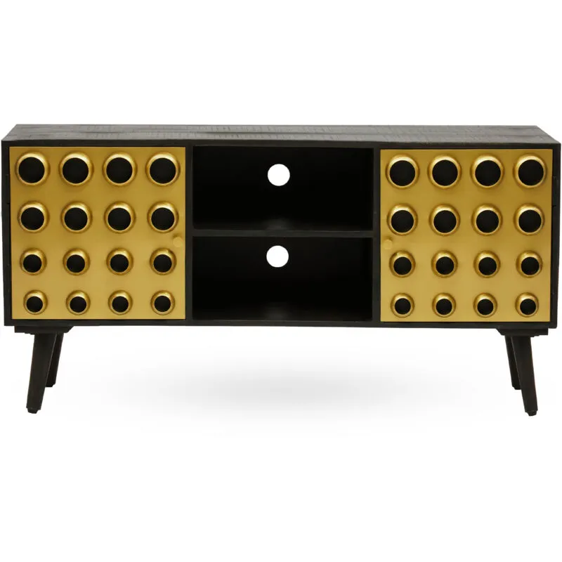 Premier Housewares - Interiors by Premier Mango Wood Media Unit, Mid-Century Modern tv Stand with Gold Accents, Black Frame with Storage Shelves