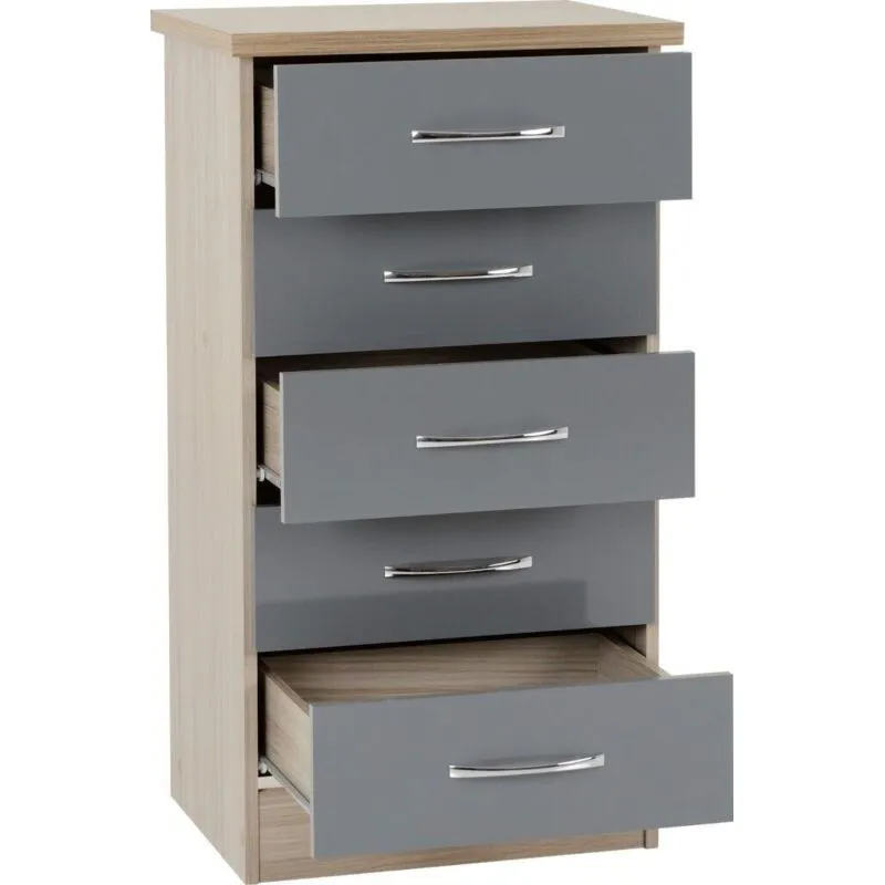 Seconique - Nevada 5 Drawer Narrow Chest - L40 x W50 x H93 cm - Grey Gloss/Light Oak Effect Veneer