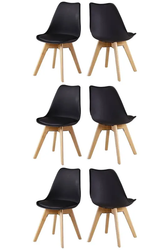 Life Interiors Set of 6 Scandinavian Dining Chairs Leather Cushions Solid Wood Legs in Black - Black - Size: One Size
