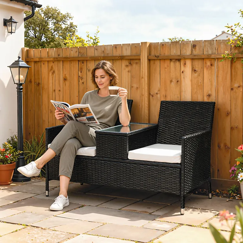OUTSUNNY Rattan Chair Garden Furniture Patio Companion Love Seat Table in Black Black
