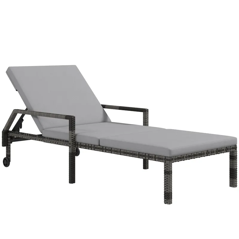 Outsunny Rattan Wicker Sun Lounger, Grey, Outdoor Recliner with 5-Level Adjustable Backrest and 2 Wheels Aosom UK
