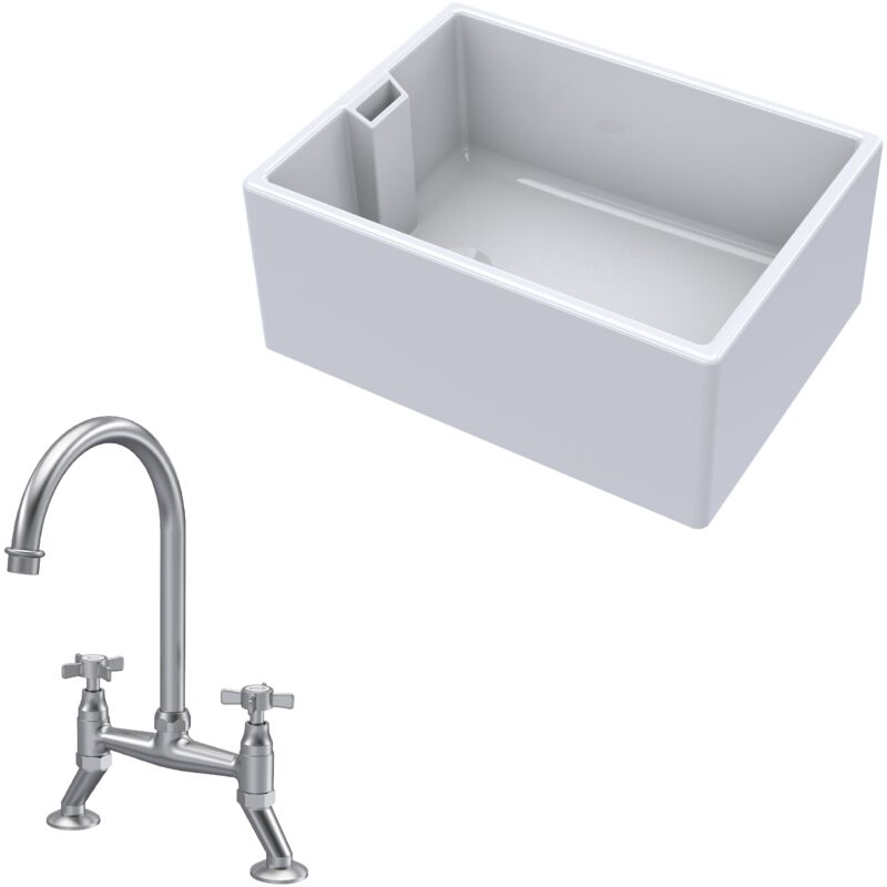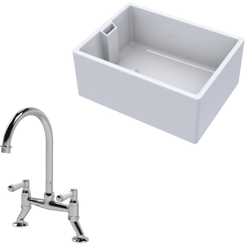Balterley Fireclay Kitchen Bundle 1 Bowl Belfast Sink with Bridge Mixer Tap, 615mm - Chrome Finish - Includes Waste