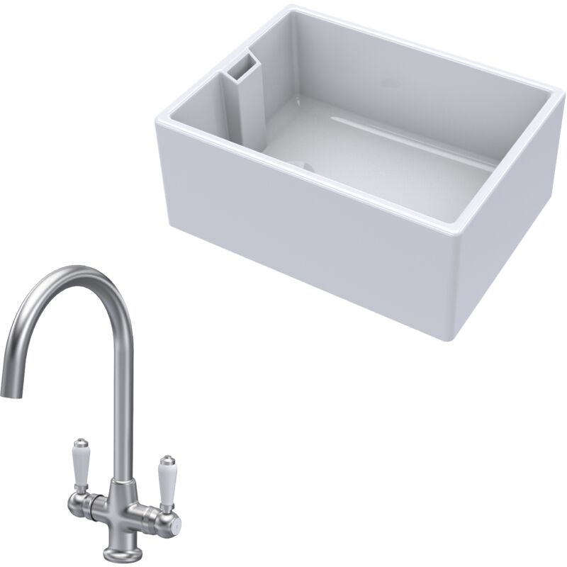Balterley Fireclay 1 Bowl Belfast Sink Tap Brushed Nickel 615mm in White White