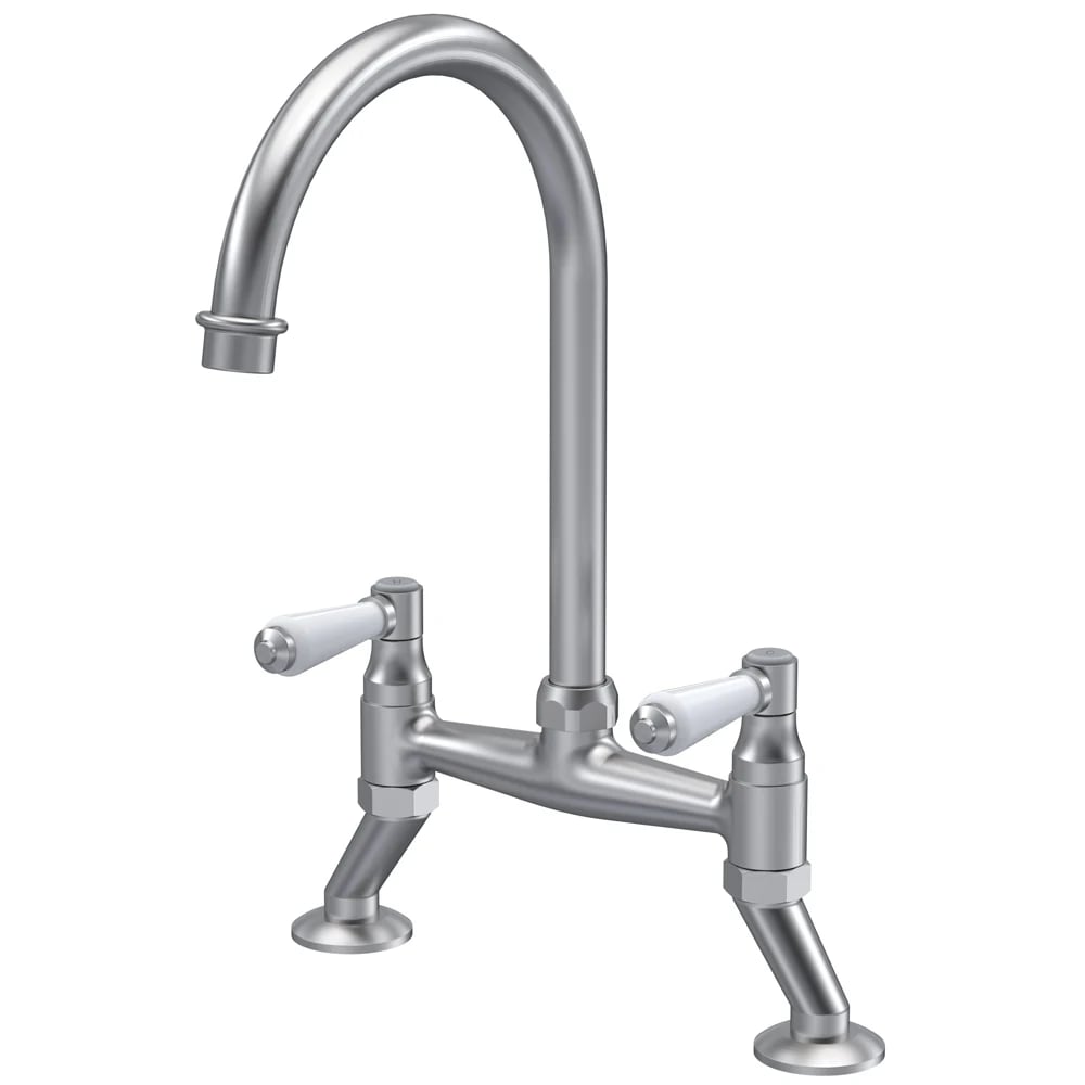 Eastlake Traditional Brushed Nickel Bridge Kitchen Mixer Tap with White Levers