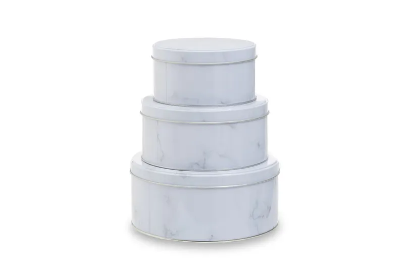 Orsina Set Of 3 White Marble Effect Storage Tins, Nesting Tins With Lids For Cakes, Snacks Or Bakes, Durable Metal White