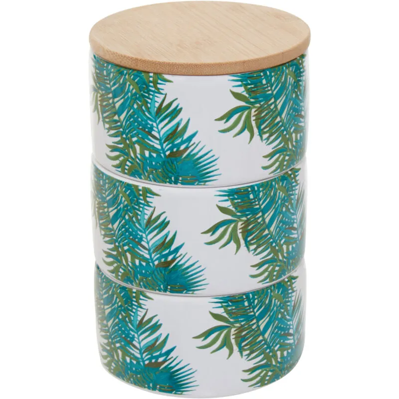 Premier Housewares - Interiors By Premier Palm Set of Three Stackable Canisters,Stoneware Containers With Palm Leaf Pattern,Canisters With Bamboo Lids