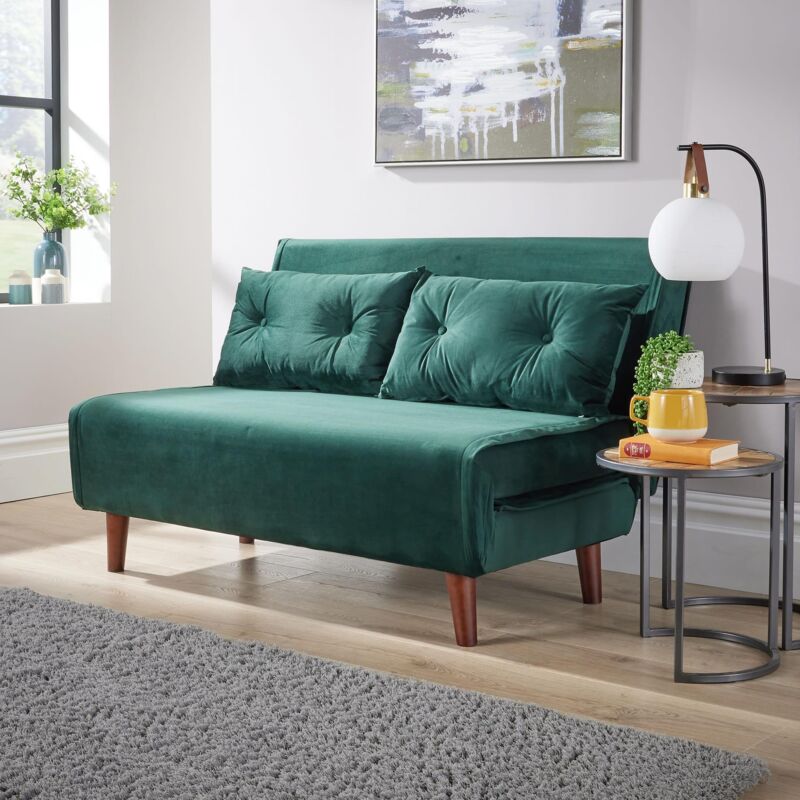 Home Source Double Sofa Bed Folding Chair Velvet Wooden Legs Two Pillow Home in Bottle Green Bottle Green