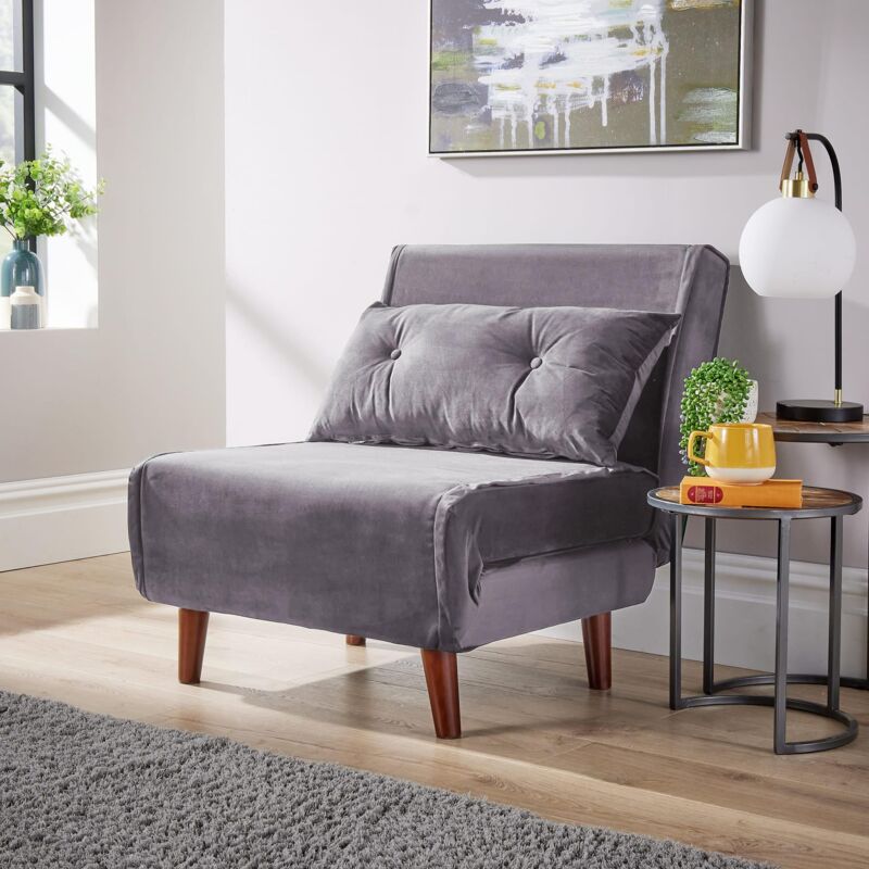 Home Source - Single Sofa Bed Folding Chair Velvet Grey Wooden Legs One Pillow Home Furniture