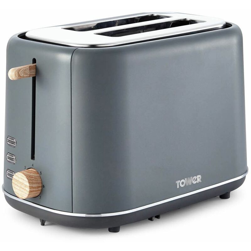 Tower Scandi T20027G 2 Slice Toaster with Adjustable Browning Control, Grey with Wood Accents